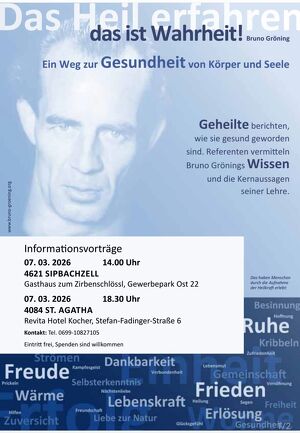 Sa 07.03.2026, von 14:00 bis 16:00 Uhr Kategorie : allgemeine Veranstaltungen Ein Weg zur Gesundheit von Körper und Seele![]() Informationsvortrag Bruno Gröning, der bedeutendste Heiler Deutschlands, lehrte uns, dass es eine universelle Lebenskraft gibt, die allen Menschen überall auf der Welt frei zur Verfügung steht. Er nannte diese kosmische Energie „Heilstrom“ und verglich den Menschen mit einer Batterie, die immer wieder aufgeladen werden muss, damit er gesund und tatkräftig sein Leben gestalten kann. Im Bruno Gröning-Freundeskreis gibt es regelmäßig Informationsvorträge, in denen Interessierte mehr erfahren und lernen können, wie sie diese geistige Kraft im Alltag für sich nutzen können. Tausende von Menschen sind dadurch schon gesund geworden, wie viele unterschiedliche Heilungsberichte bezeugen. So gibt es Heilungen von organischen Leiden, wie z.B. Osteoporose, Arthrose, Krebs, Herzerkrankungen, MS, aber auch von Depressionen sowie von psychischen und körperlichen Suchterkrankungen. In der Medizinisch-Wissenschaftlichen Fachgruppe (MWF) des Bruno Gröning- Freundeskreises werden weltweit die Heilungen sorgfältig geprüft und dokumentiert. Alle Interessierten sind zum Vortrag herzlich eingeladen. Der Eintritt ist frei, eine Spende wird erbeten. Preis : KostenlosVorverkauf : KostenlosErmäßigung : Kostenlos Veranstalter Bruno Gröning-Kreis für natürliche Lebenshilfe Österreich, ZVR 7773628330699-10827105 Mail an den Veranstalter Veranstaltungsort Gasthaus zum Zirbenschlössl Gewerbepark Ost 22 4621 Sipbachzell | Werbung : Ihre Werbung auf dieser Seite! Veranstaltungen Jetzt Ihre Veranstalungen KOSTENLOS in unserem Veranstaltungskalender Netzwerk eintragen! --> weitere Informationen Unser Netzwerk Wussten Sie, das die Informationen auf dieser Internetseite, nicht nur hier auf Wels-land24.at erscheinen, sondern auch auf jeder thematisch und geografisch passenden Internetadresse unseres Domain Netzwerk ausgeliefert werden. Mehr über die Möglichkeiten die dir das RootWeb.EU Domain Netzwerk bieten kann, erfährst du hier erfahre mehr über deine Möglichkeiten! Wussten Sie, das zu unserem Domain Netzwerk auch Veranstaltungskalender.net gehört, einer der größten Veranstaltungskalender in Österreich, auf dem Sie kostenlos Ihrer Veranstaltungen eintragen können. www.veranstaltungskalender.net |